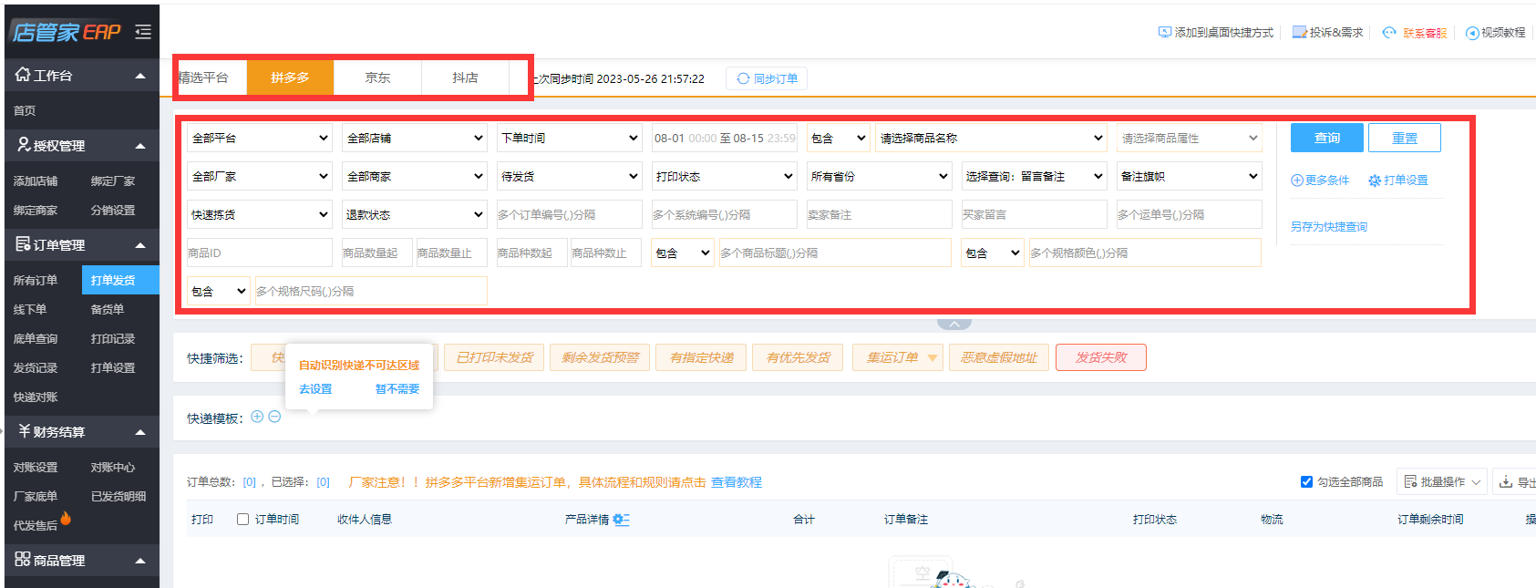进入店管家分销代发erp系统,如在打单发货列表,可根据平台,订单相关要求进行筛选。也可以自由设置筛选条件。