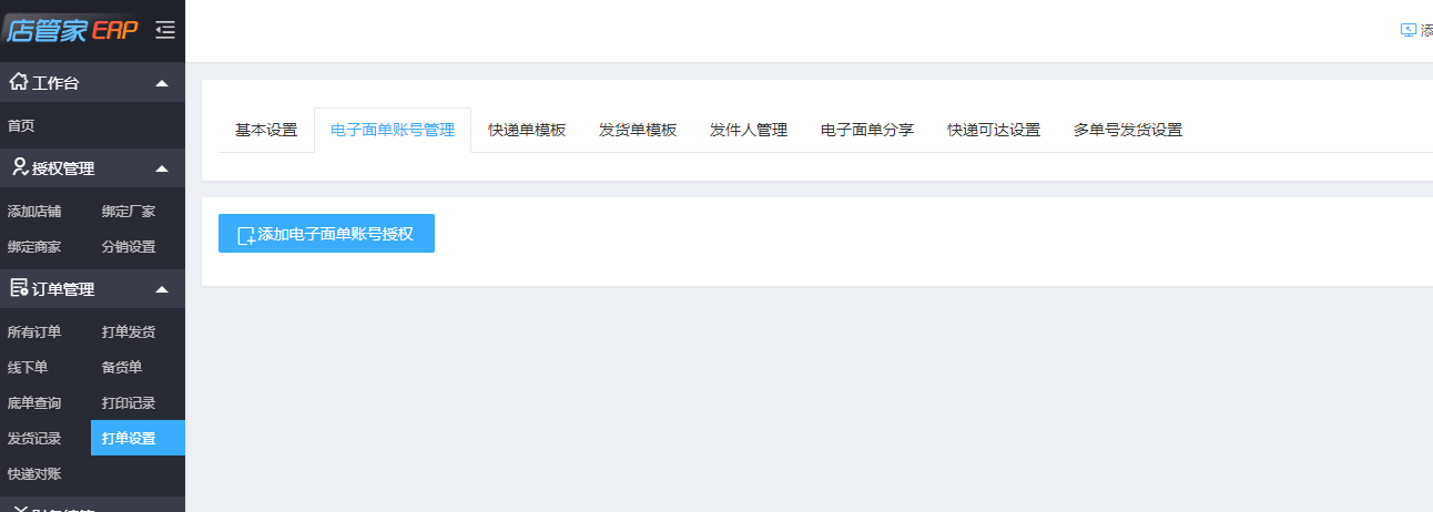 进入【订单管理】-【打单设置】-【电子面单账号设置】,添加好电子面单账号。