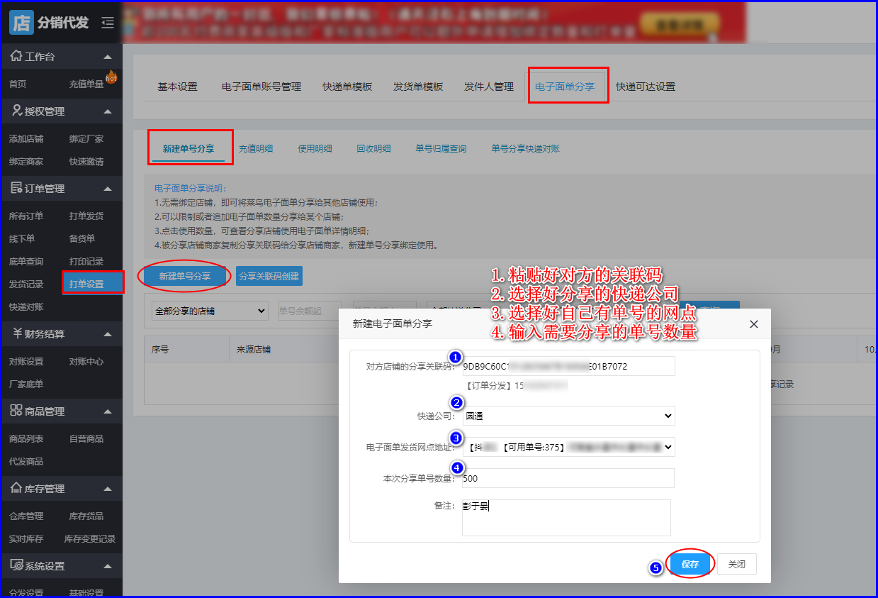 3.分享主,点击(打单设置>>>>>电子面单分享>>>新建单号分享),新建单号分享,把对方的关联码粘贴后选择好数据输入数量即可分享成功。