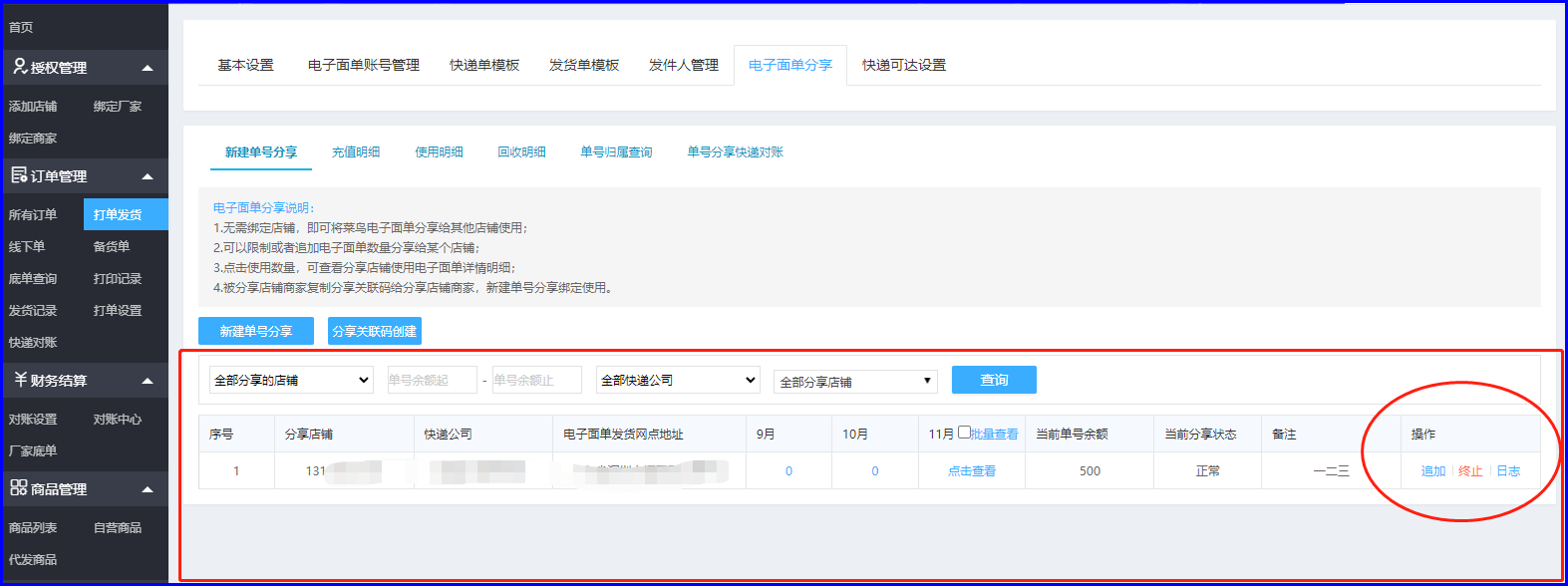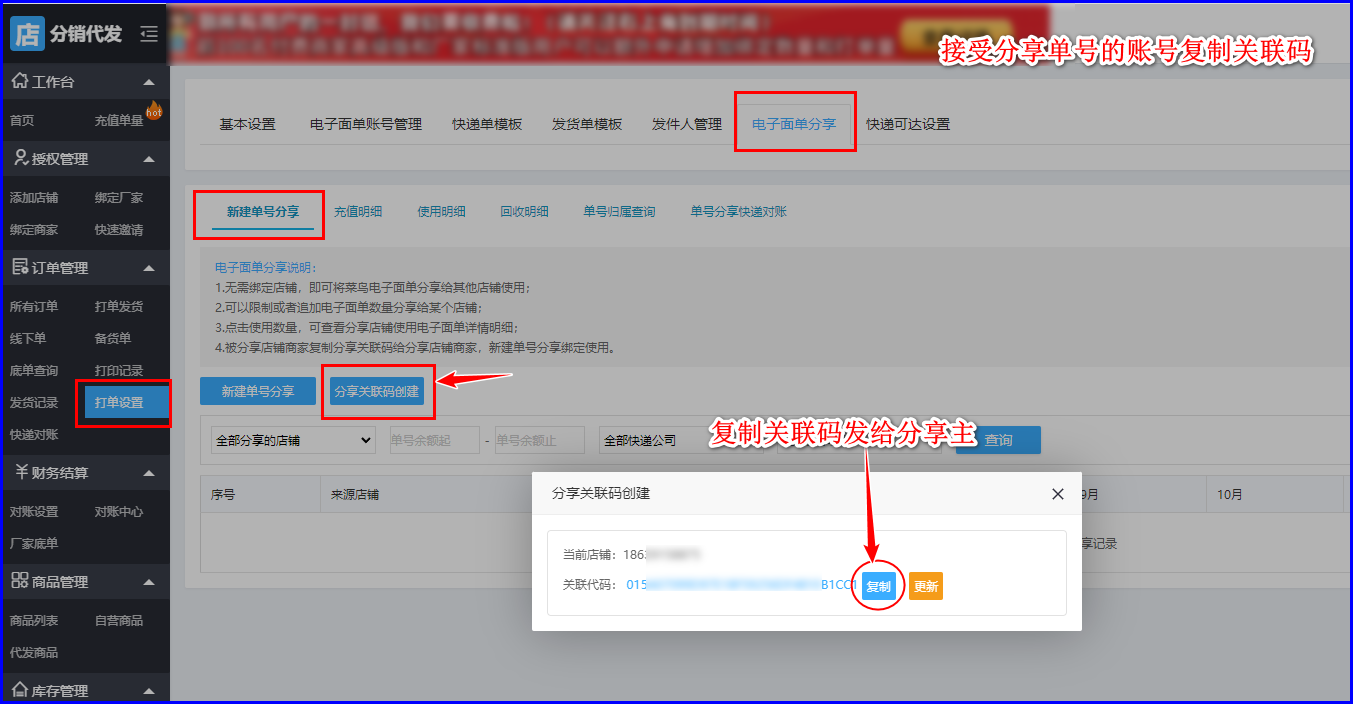 1. 接受分享的账号打开分销代发的电子面单分享页(打单设置>>>>>电子面单分享>>>新建单号分享),