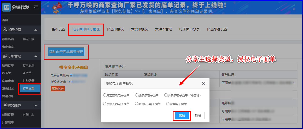 2.分享主授权好电子面单:打单设置>>>>>电子面单账户管理,选择好电子面单类型,授权好电子面单。