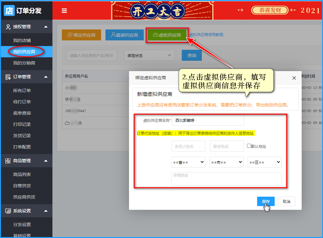 目前店管家-订单分发已实现虚拟供应商的绑定,来实现订单的导出,分销商可将表格发给供应商再去打单。