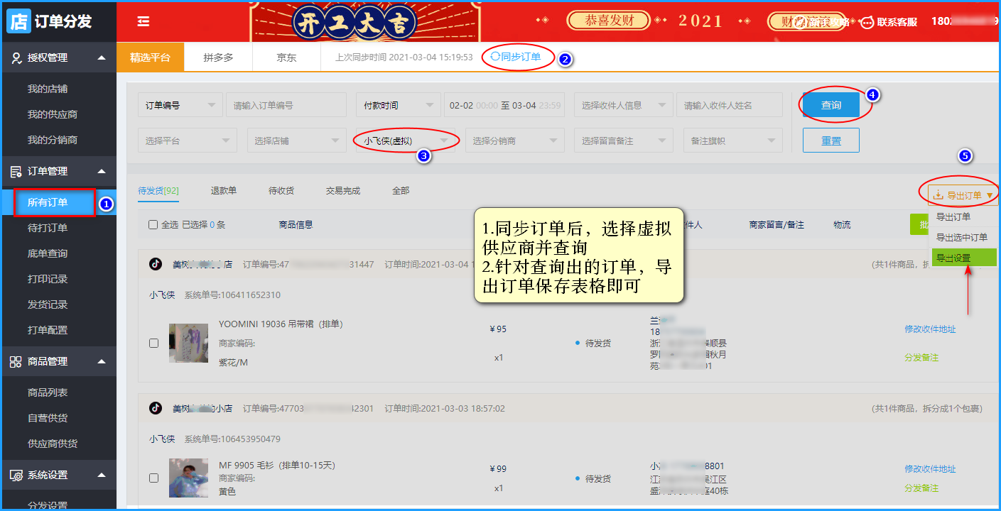 4.绑定后,点击所有订单,筛选虚拟供应商,查询出对应的订单,设置导出内容进行导出订单;