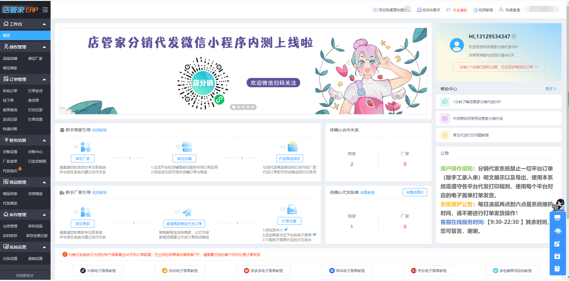 进入系统后绑定厂家帐号和店铺,即可开始让厂家代发货,发货后运单号自动回传到店铺后台。