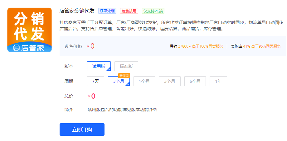 如果使用店管家分销代发软件,抖店新开店<=60天内营业的新商家,可免费试用3个月。名额数量不够,先到先得。