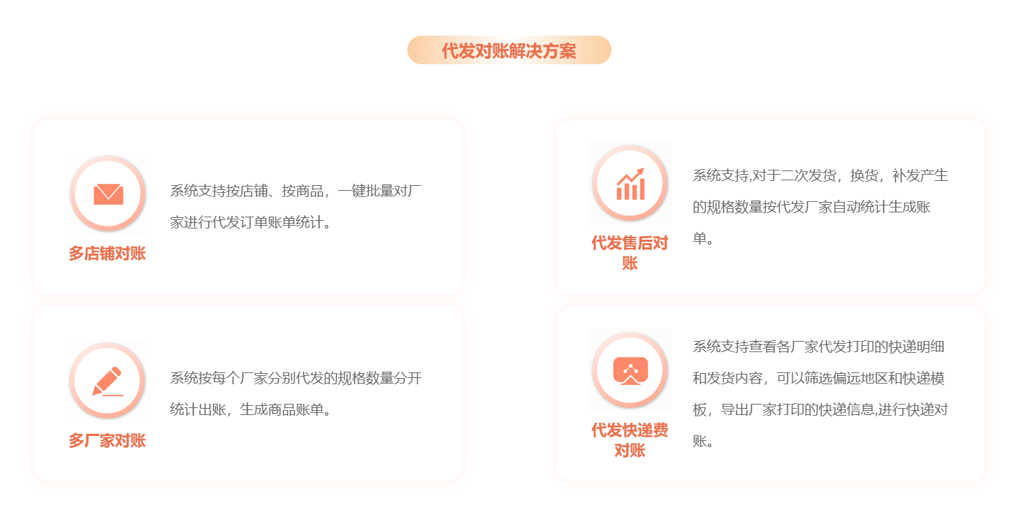 只需和厂家进行相应的绑定,当有订单后,订单会自动推送到工厂,工厂端即可开始打单发货。运单号自动回传到店铺后台,无需手工再导入导出。