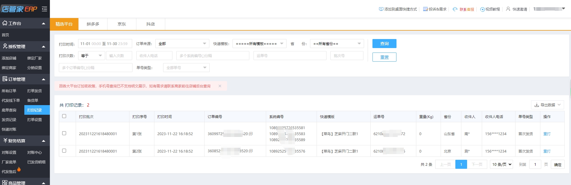 分销商家和厂家都必须使用店管家分销代发系统才能够查询到打印记录。如果是不同系统是无法查询的。